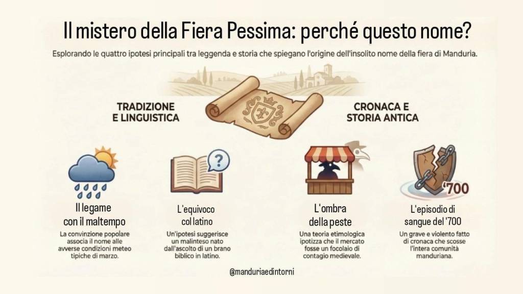 Una teoria lega il termine a un equivoco linguistico nato dall’ascolto di un brano biblico in latino, mentre un’altra ipotesi richiama un grave episodio di sangue avvenuto nel ‘700 che scosse la comunità. Una terza interpretazione suggerisce una correlazione etimologica con la peste, ipotizzando che il mercato sia stato un focolaio di contagio in epoca medievale.