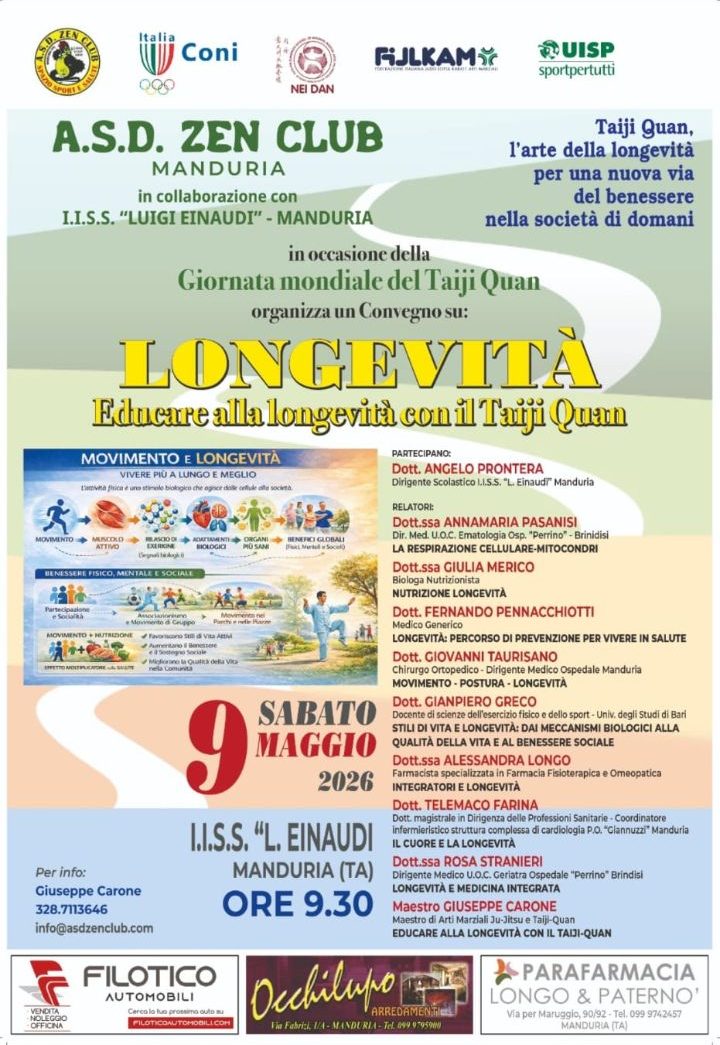 Il prossimo 9 maggio 2026, presso l’Istituto I.I.S.S. “Luigi Einaudi”, la comunità scientifica e sportiva si riunirà per il convegno “Longevità: educare alla longevità con il Taiji Quan” .