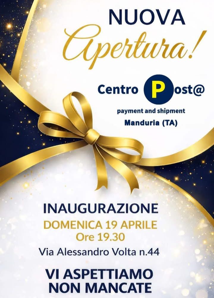 Come vi ho mostrato stamattina in questo Reel, domenica 19 aprile, alle ore 19:30, ci sarà l’inaugurazione una nuova attività “Centro Posta Manduria”.